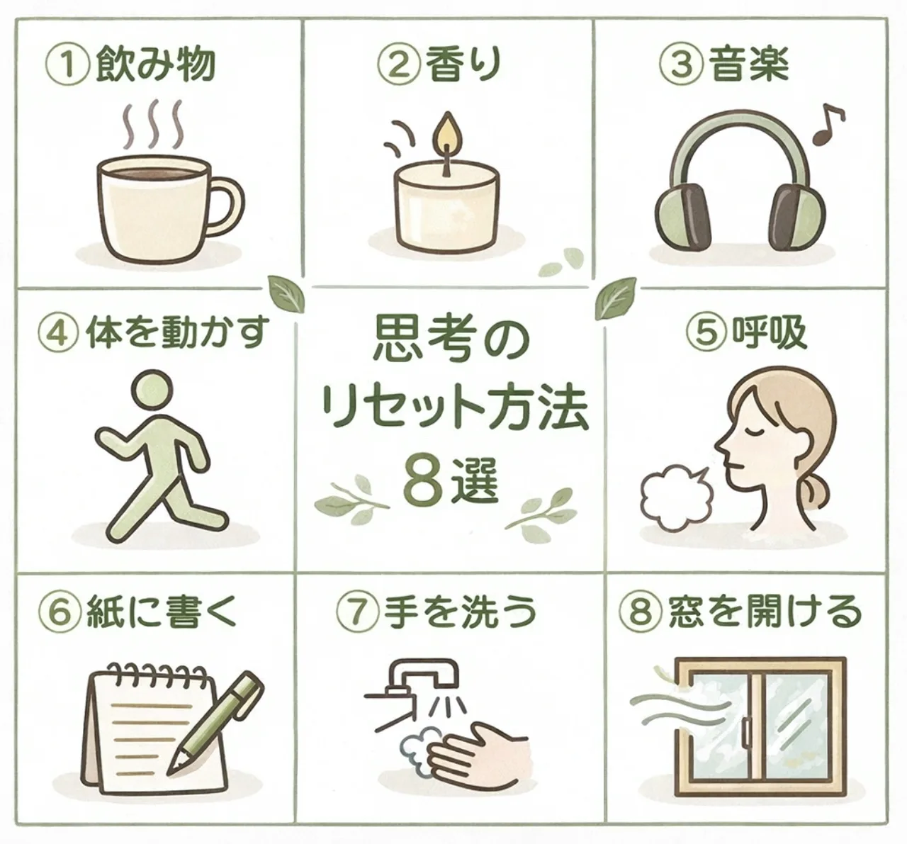 この記事では、そんな「思考のループ」に入ってしまっているときに役立つ、無理せずできる思考のリセット方法を8つご紹介します。