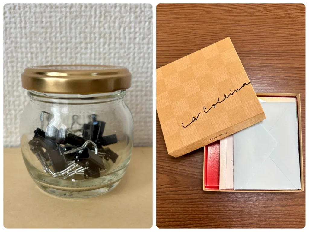 プリンの空き瓶と、お菓子の空き箱を再利用してみました。
